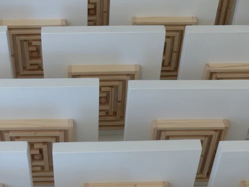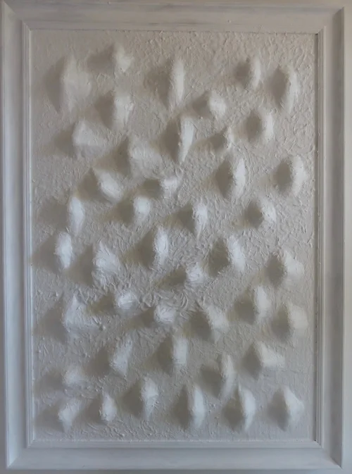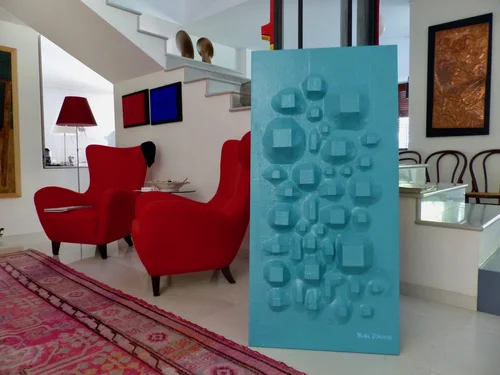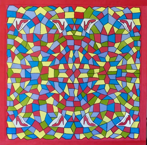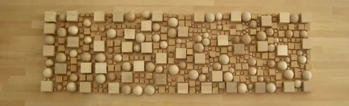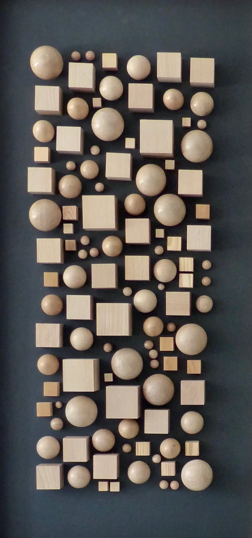 Dal caos originario alla vita :i pannelli rappresentano ognuno un tassello del processo creativo che dal Big Bang ha portato alla vita e a forme sempre più complesse di esistenza. Dal minuscolo puntino cosmico che ha originato 4.500 miliardi di anni fa il Big Bang si è passati alla vastità dell’essere attraverso fondamentali transizioni che segnano i passaggi da un’era all’altra del tempo geologico della Terra. Le transizioni più importanti sono l’emergere delle prime strutture capaci di replicarsi che passano informazioni ereditabili, dette protocellule, cui seguono i primi organismi procarioti. Poi arrivano gli organismi eucarioti, i cui mitocondri forniscono più energia, alimentano più cromosomi, più geni, e un flusso di informazioni molto maggiore. Segue quindi l’evoluzione della vita multicellulare, con il trasferimento delle informazioni a tutte le cellule, quindi c’è una transizione agli animali sociali, che passano le informazioni a interi gruppi della stessa specie per poi avere l’avvento di società animali dotate di un linguaggio, che costituisce un’ulteriore svolta nella trasmissione di informazioni. Quindi c’è l’homo sapiens con la transizione dalla vita naturale all’intelligenza e infine il passaggio dall’intelligenza autoreferenziale alla vita morale e spirituale. Un processo i cui passaggi fondamentali vedono un accrescimento della complessità, dell’armonia, delle informazioni trasmesse. Perciò i tasselli di legno con estroflessioni delle serie vedono una crescita degli elementi e dei colori che caratterizzano ciascuno di essi in un quadro complessivo in cui c’è armonia e equilibrio. Questo processo è il frutto del caso, come vuole la teoria dell’evoluzione naturale, oppure è espressione di una logica presente fin dall’origine nell’universo e che è riconducibile ad un principio impersonale immanente alla realtà naturale, come il Dharma dei buddisti, oppure a un’entità personale come il Dio delle tre religioni monoteiste?