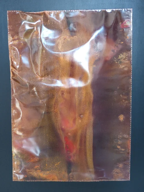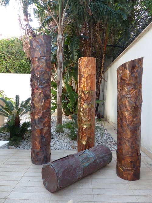 Il rame esprime due caratteristiche apparentemente opposte: la robustezza e la possibilità di essere plasmato e quindi di cambiare. Il processo di naturale ossidazione del metallo rafforza questa sua capacità espressiva. Il rame cambia lentamente nel tempo, si trasforma inesorabilmente, assume colori cangianti che sfuggono alla prevedibilità. Il processo d’ossidazione e l’intervento umano con fuoco e martelli producono effetti cromatici che, disponendosi secondo linee concentriche, richiamano il trascorrere del tempo.